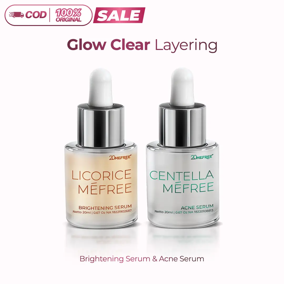 Glow & Clear Mefree adalah paket perawatan kulit yang memadukan Licorice Brightening Serum dan Centella Acne Serum, diformulasikan untuk mencerahkan kulit sekaligus merawat kulit berjerawat agar tetap sehat dan bersih.